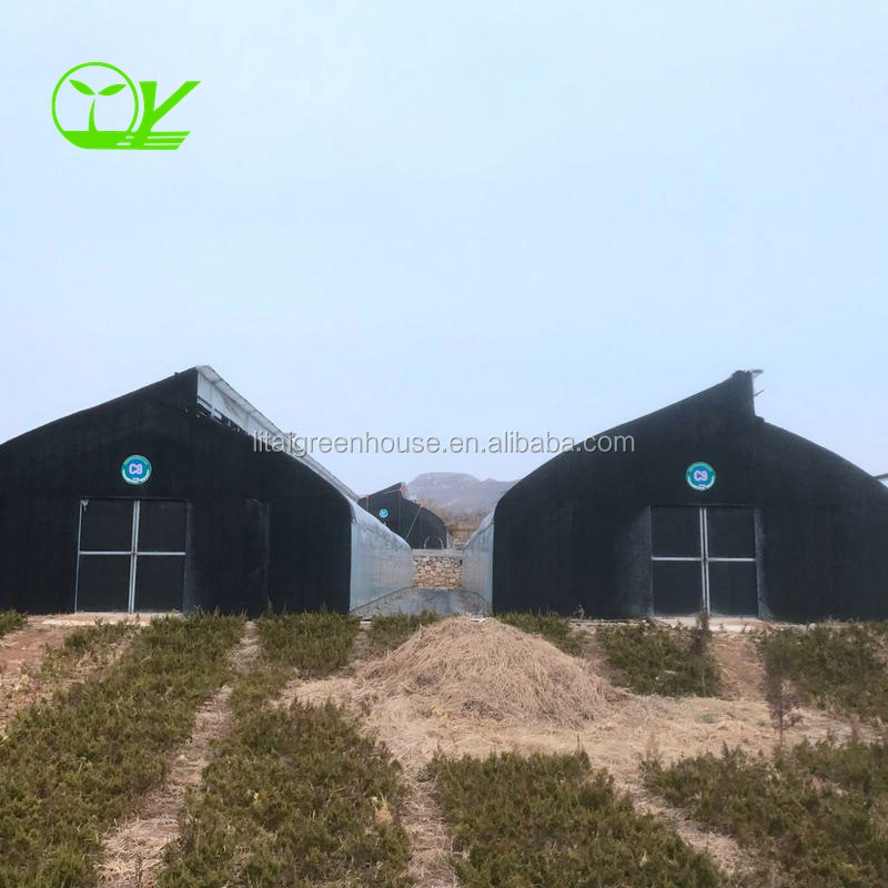 Το θερμοκήπιο μανιταριών έχει δύο τύπους: το ένα είναι ένα θερμοκήπιο που καλύπτεται από μαύρο και άσπρο φιλμ, το άλλο είναι ένα μικρό θερμοκήπιο τούνελ σε ένα μεγαλύτερο θερμοκήπιο με δίχτυ σχίσματος.